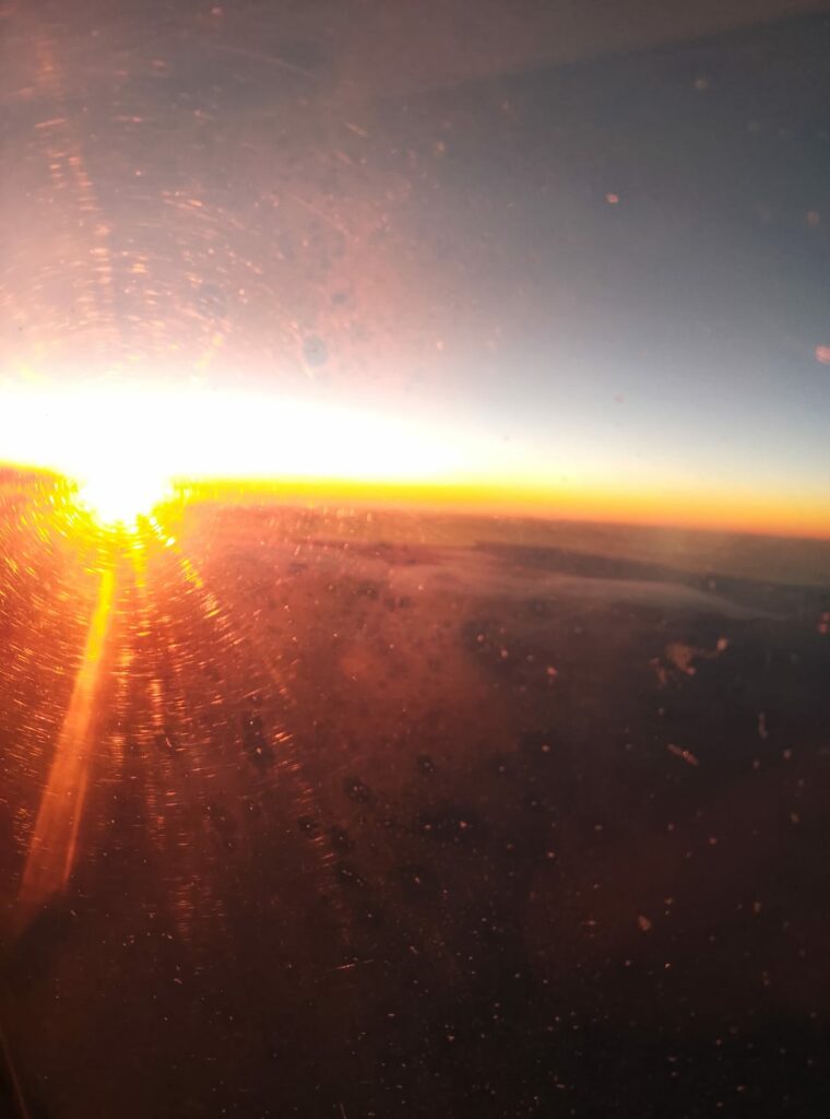 Nous avons décollé bien avant que les étourneaux ne se réveillent… peu après notre départ, le jour s’est levé. Vénus brillait dans l’aube naissant. De ma place, près du hublot, le ciel dégagé, me laissait voir la mer Méditerranée , le trait de côte et l’Espagne défilant sous les ailes.